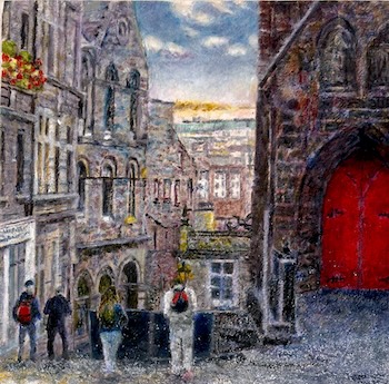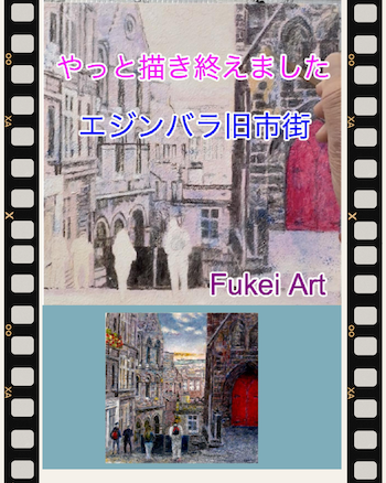 この絵は、イギリス・エジンバラ旧市街を描いたもので、空を主役にした作品です。私は一日の中で、早朝とこの絵のような夕焼け前の時間帯が好きです。朝夕に人々が動き出す前の穏やかな静寂、そんな絵を描きたいです。