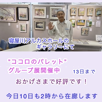 寝屋川アルカスでの”ココロのパレット”グループ展でのことです。9名の画家が様々な画材、モティーフの絵を出品しました。